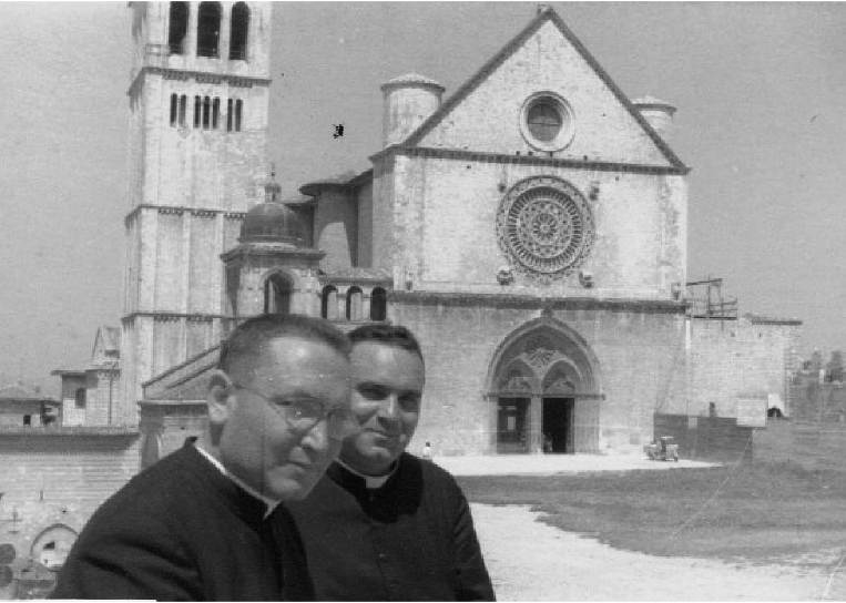 Foto: Il parroco don Mario Melengugno con il viceparroco don Nino Russo ad Assisi (1960).