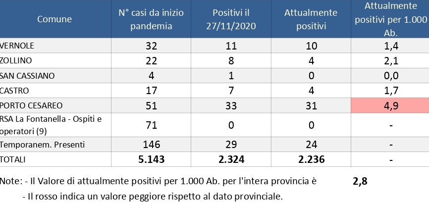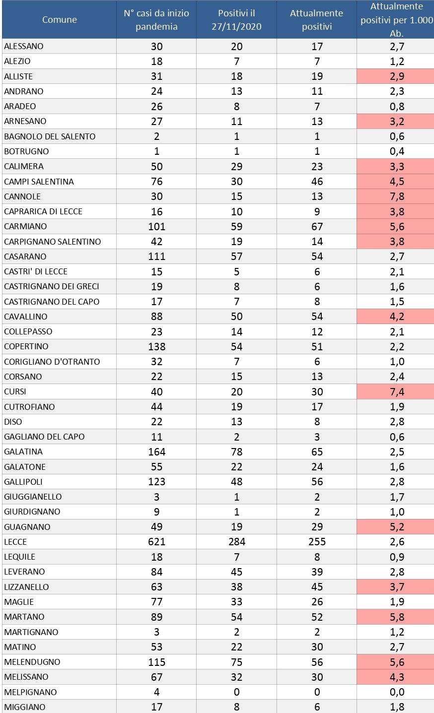 Rispetto al valore “di attualmente positivi per 1.000 abitanti”, che per l'intera provincia questa settimana è 2,8 casi, in tutti i Comuni dell’area vengono rilevati dati superiori rispetto a quello provinciale (Campi Salentina 4,5 ogni 1000 abitanti; Carmiano 5,6; Guagnano 5,2; Novoli 4,8; Salice 3,6; Porto Cesareo 4,9; Veglie 3,6).