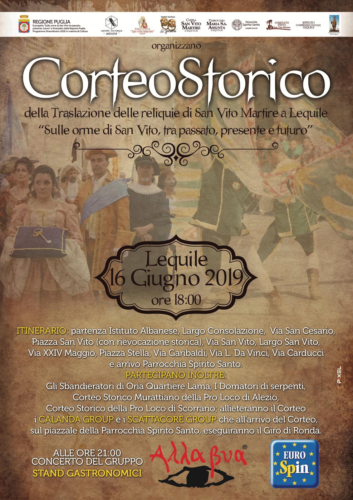 “Sulle orme di San Vito, tra passato, presente e futuro”. Si svolgerà oggi, alle 18, il tradizionale Corteo storico della traslazione delle sacre reliquie del patrono di Lequile. Oltre seicento partecipanti, tutti in abiti d’epoca, sfileranno per le vie del paese assieme agli sbandieratori di Oria e ai Cortei storici di Alezio e Scorrano.