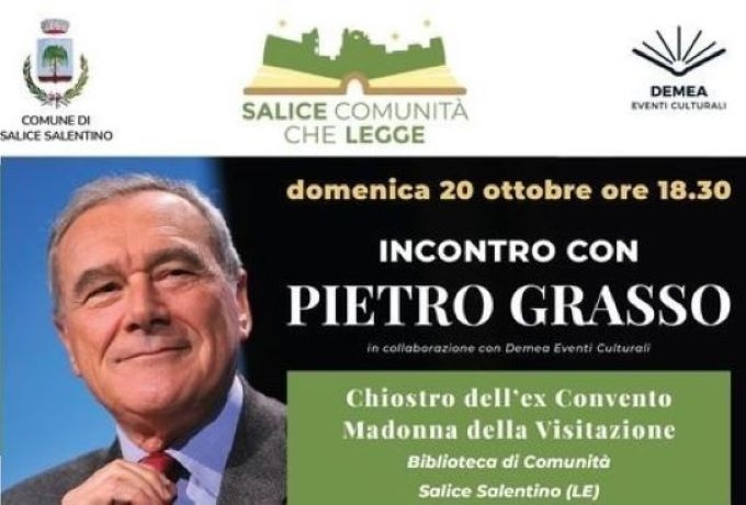 “Cultura come impegno civile: verso la nuova Biblioteca di Comunità”. È il tema dell’incontro con Pietro Grasso che si terrà domenica 20 ottobre 2024, alle ore 18.30, presso il Chiostro del Convento “Madonna della Visitazione” di Salice Salentino (in caso di maltempo, l'evento si svolgerà nel Centro Polifunzionale "Padre Benigno Perrone").
