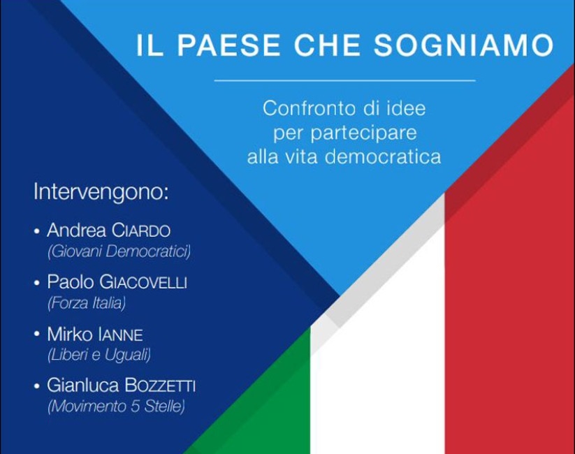 Interverranno Andrea Ciardo, dei Giovani democratici, Paolo Giacovelli, di Forza Italia, Mirko Ianne, di Liberi e uguali, Gianluca Bozzetti, del Movimento 5 Stelle.