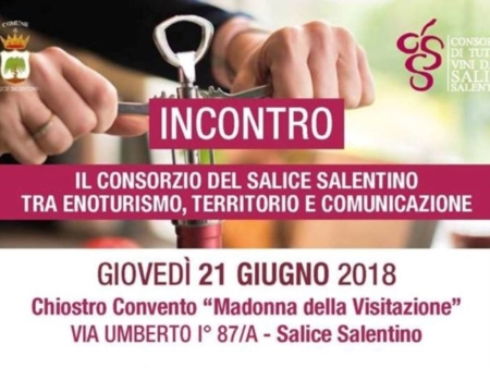 SALICE – “Il Consorzio del Salice Salentino tra enoturismo, territorio e comunicazione”. Questo il tema dell’incontro che si terrà giovedì prossimo, alle 19, nel chiostro del Convento francescano “Madonna della Visitazione”.