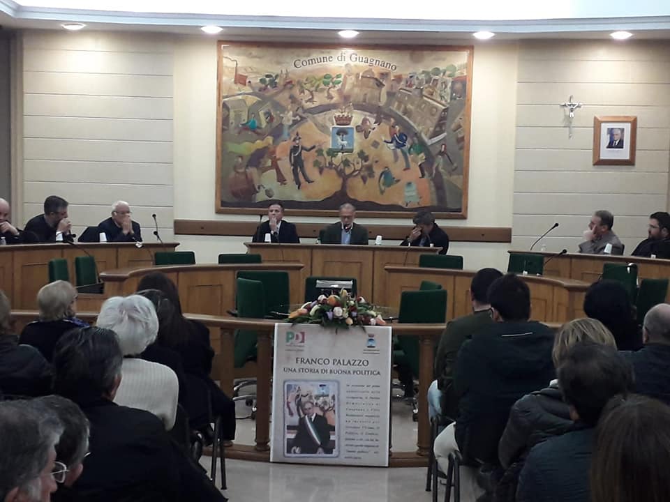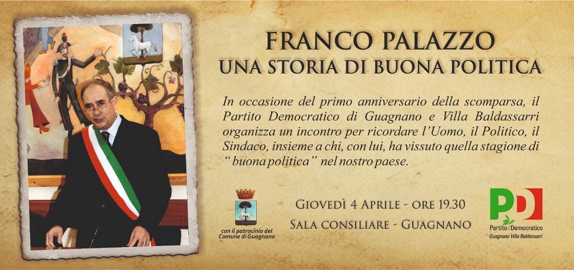Sfogliando il libro della memoria collettiva di questa comunità è impossibile non soffermarsi sulle pagine che toccano quel decennio 1994/2004, quel voltar di secolo, nel quale si respiravano tempi difficili per la politica e per il governo della cosa pubblica. Una sfiducia diffusa aleggiava nei respiri del vivere quotidiano, e in quella così particolare congiuntura, Guagnano, il suo popolo, fece una scelta di grande maturità, chiamò quella operosa riservatezza, di padre e insegnante, quella apparente ruvidità caratteriale, quella personale penombra di Franco Palazzo e lo scelse come primo cittadino, come coordinatore di un gruppo diffuso, di una squadra, come animatore di una nuova stagione capace di ridare a quella funzione civica, politica e di governo, un rinnovato spirito di servizio, un ritrovato senso di fiducia, di affidabilità e di coesione sociale.