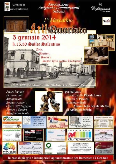 SALICE - Mercatino dell’antiquariato, artigianato e arte. Si terrà oggi, dalle 15.30, in via Umberto I, la prima edizione di “ArtiQuariato”, già programmata per la scorsa settimana e poi rinviata per il maltempo.