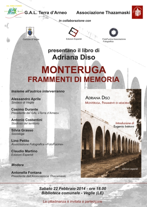 Un libro per riscoprire luoghi ed emozioni d’altri tempi. Sarà presentato oggi, alle 18, nella Biblioteca comunale di Veglie, il libro di Adriana Diso “Monteruga, frammenti di memoria” (Edizioni Esperidi).
