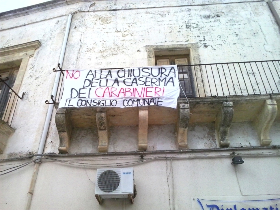 SALICE – “No alla chiusura della caserma dei carabinieri”; firmato: “Il Consiglio comunale”. Questo il testo dello striscione apparso ieri pomeriggio, in piazza Plebiscito, su un balcone di un antico palazzo.