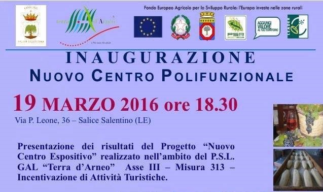 SALICE – Un Centro espositivo per i prodotti tipici e di qualità. Sarà inaugurato oggi, alle 18.30, in via Pasquale Leone, un nuovo punto informativo della rete del Gal “Terra d’Arneo”, promosso dal Comune nell’ambito della misura “Incentivazione di attività turistiche, creazione di itinerari naturalistici ed enogastronomici”.