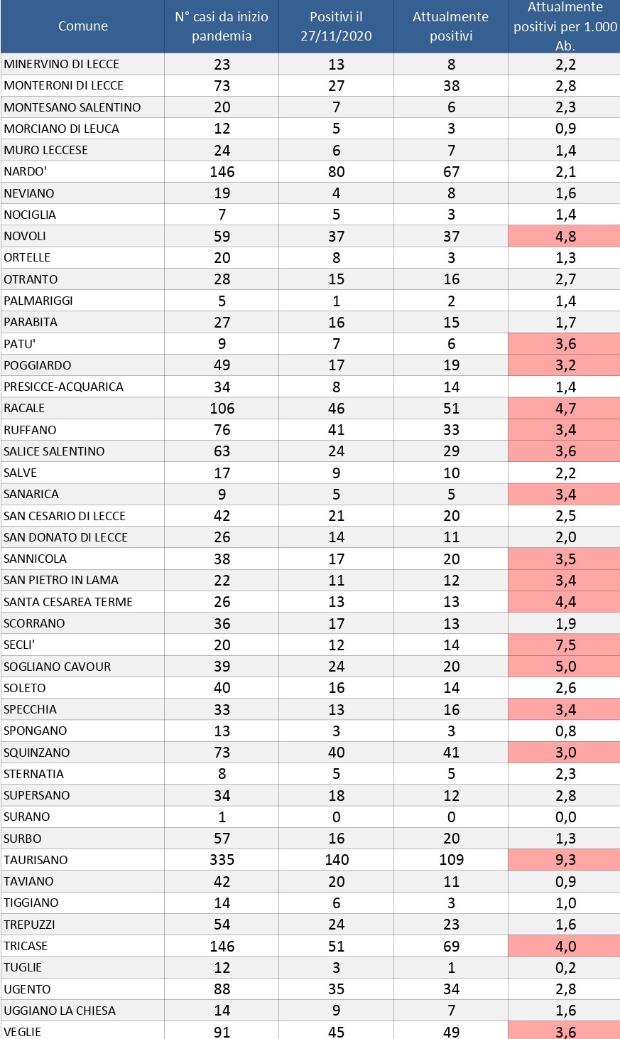 Rispetto al valore “di attualmente positivi per 1.000 abitanti”, che per l'intera provincia questa settimana è 2,8 casi, in tutti i Comuni dell’area vengono rilevati dati superiori rispetto a quello provinciale (Campi Salentina 4,5 ogni 1000 abitanti; Carmiano 5,6; Guagnano 5,2; Novoli 4,8; Salice 3,6; Porto Cesareo 4,9; Veglie 3,6).