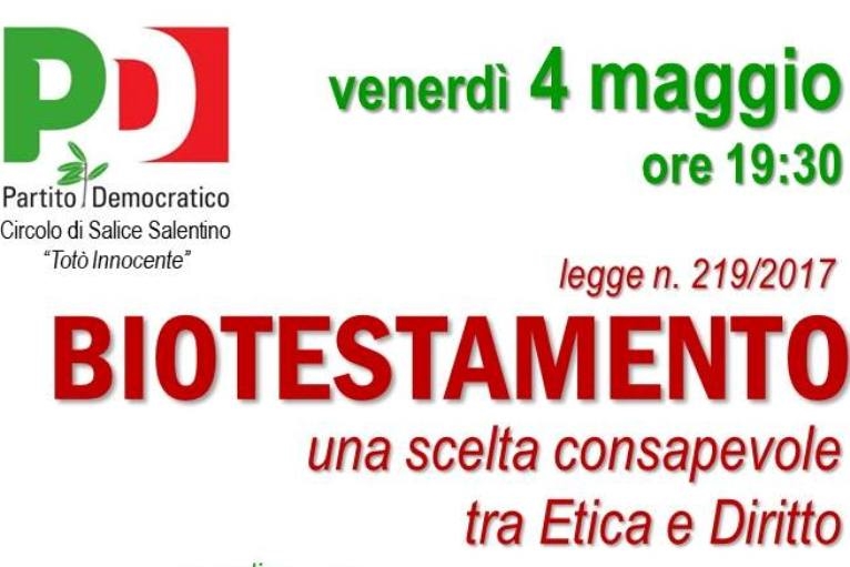 L’iniziativa, promossa dal locale Circolo Pd “Totò Innocente”, ha l’obiettivo di illustrare i contenuti della Legge 219/2017 (Norme in materia di consenso informato e disposizioni anticipate di trattamento).