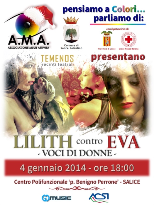 SALICE - "Lilith contro Eva: voci di Donne". E’ il titolo della rappresentazione teatrale che si terrà oggi, alle 18, nel Centro polifunzionale “Padre Benigno Perrone”. L’appuntamento, a cura di “Temenos – recinti teatrali”, è stato organizzato dall’associazione Ama e dal Comune con il patrocinio della Croce rossa italiana e della Provincia di Lecce.
