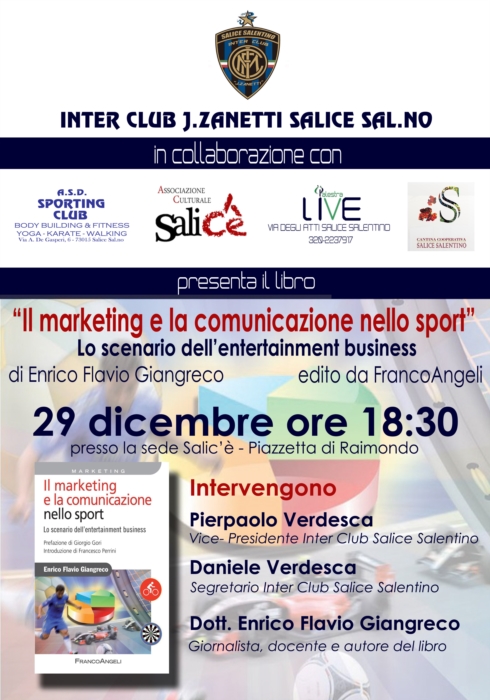 All’appuntamento, che si terrà oggi alle 18.30, nella sede di Salic’è, parteciperà Enrico Flavio Giangreco, docente dell’Università eCampus, collaboratore di Sportitalia e autore del libro “Il marketing e la comunicazione nell’ambito delle società sportive”.